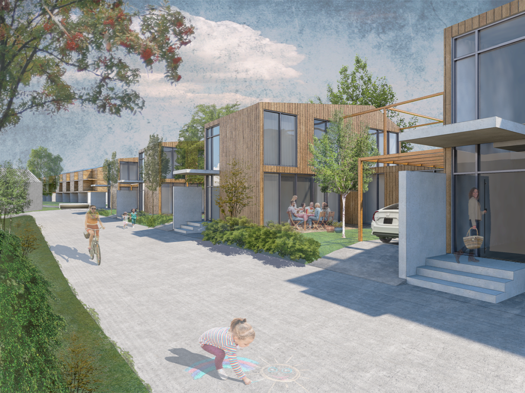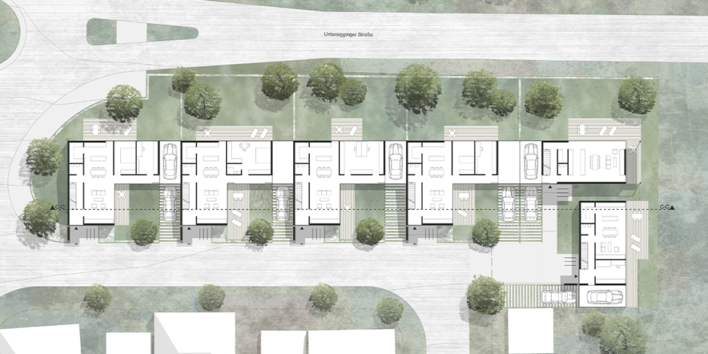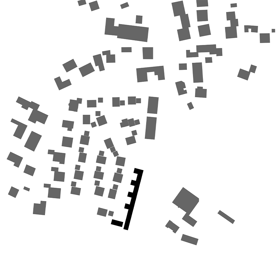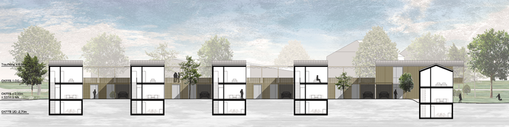 Der südliche Auftakt mit zwei Einfamilienhäuser um einen gemeinsamen Erschließungshof markiert den neuen Ortseingang. Für das restliche Baufeld ist eine Kettenhausbebauung vorgesehen. Durch die additive Anordnung entstehen dreiseitig eingefasste Wohnhöfe, welche unmittelbar an die Wohnbereiche anschließen.