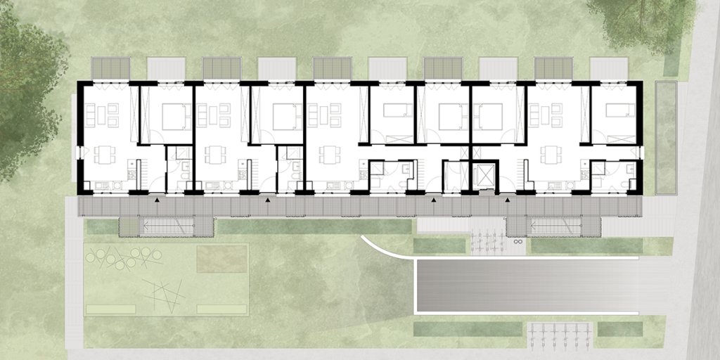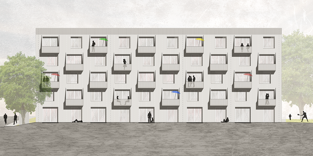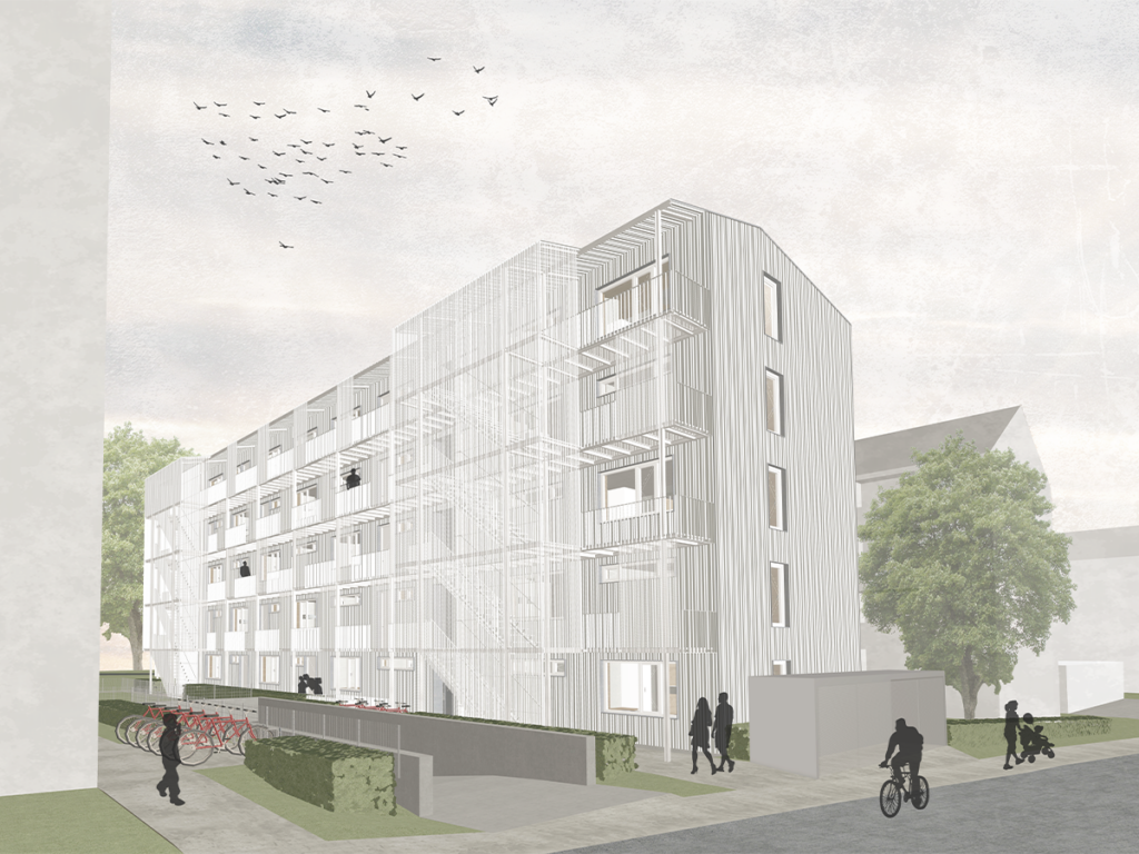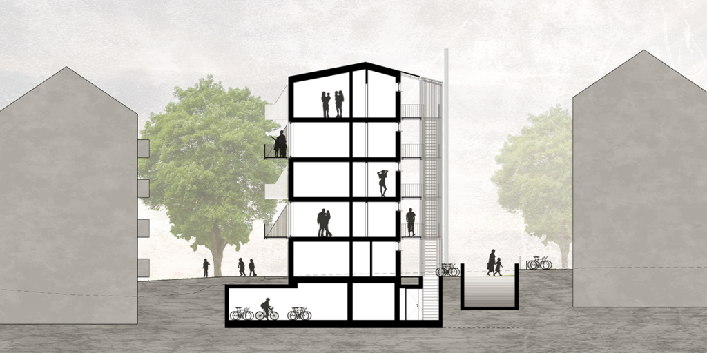 Bei einer nutzbaren Gebäudetiefe von 7,75 m zählt jeder Zentimeter. So basieren die Raumtiefen auf minimal erforderlichen Bewegungsflächen, wie Behindertengerechtigkeit, Nutzbarkeit von Wohnräumen und Brandschutzanforderungen. Die Tragkonstruktion besteht aus einem Holz-Beton-Hybridbau bzw. beim Laubengang und den abgehängten Balkonen aus einem Stahlskelett, welche allumfassend mit weißem, teils gelochtem, Trapezblech verkleidet ist.