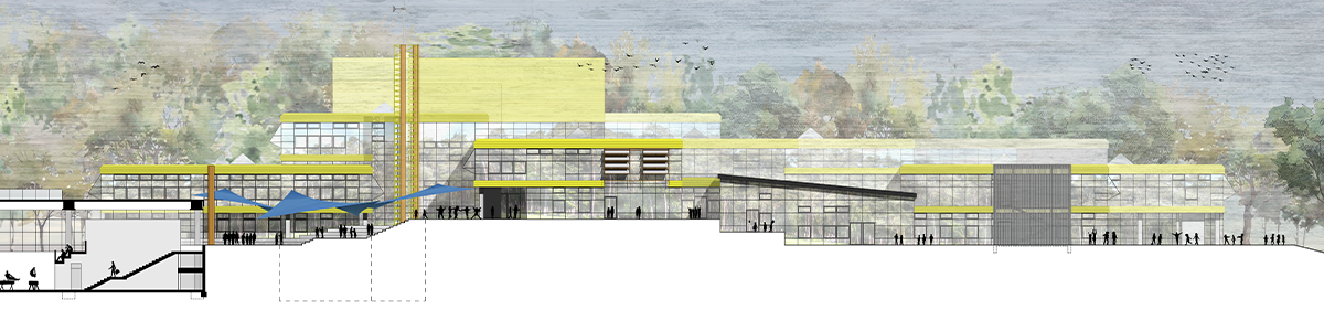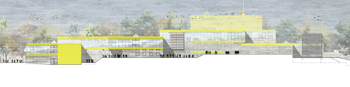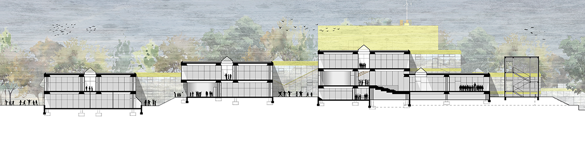 Das Schulgebäude ist als weitläufiger, modular aufgebauter Komplex organisiert und umfasst rund 16.195 m² BGF. Die Anlage fügt sich durch Staffelung und Terrassierung gut in die Topografie ein. Der Baukörper setzt sich aus mehreren rechtwinkligen, zwei- bis dreigeschossigen Klassenzimmertrakten mit Flachdächern zusammen, die zueinander versetzt angeordnet sind. Drei durchgehende Verbindungsgänge in Nord-Süd-Richtung erschließen die Module und bilden das zentrale Erschließungssystem. In Ost-West-Richtung schließen schmalere Flure an, von denen die Klassenzimmer als Zweibundanlagen erschlossen werden. Der gesamte Grundriss basiert auf einem strengen Raster von 1,20 m × 1,20 m. Konstruktiv handelt es sich um einen Stahlbetonbau, der nach außen durch großflächige Glasfassaden leicht und transparent wirkt. Die Fassaden sind durch gelbes Trapezblech und filigrane, orangefarbene Stahlrohre gegliedert. Innen- und Außenräume sind eng miteinander verzahnt: begrünte Innenhöfe, ein Atrium sowie ein terrassierter Schulhof lockern den Komplex auf. Mittelpunkt der Anlage ist ein großzügiges, über ein Glasdach belichtetes, Atrium.