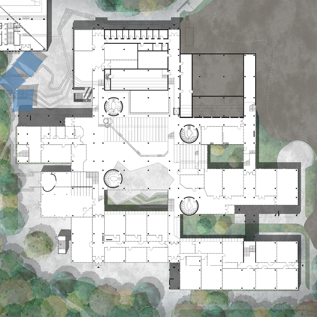 Bestandteil meiner Arbeit war neben der Teilnahme an den regelmäßigen Jours-fixes und weiteren Fachbesprechungen auch wiederkehrend Grundlagenermittlungen mit Bestandsaufnahmen. Nach der Entwurfsplanung für die Baustellenlogistik und Bauabschnitte, die Sanierung der Sanitärbereiche und Klassenzimmer, sowie der neuen Fluchttreppenhäuser und des temporären Ersatzneubaus erstellte ich hierfür die Bauanträge. Des Weiteren entwickelte ich in der Ausführungsplanung die Sanierungsdetails der Fassade und des Daches. Für die Sanierung der Geländer im Innen- und Außenbereich schrieb ich das Leistungsverzeichnis der Metallbauarbeiten aus.