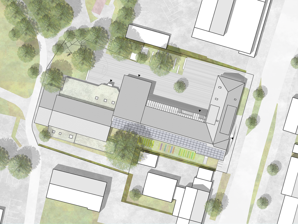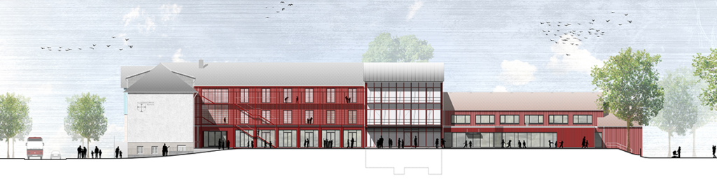 Bis auf die zwei ältesten Gebäudetrakte im Osten wird der Komplex mit Holzlamellen in unterschiedlichen Rottönen verkleidet. Der für den Brandschutz notwendige Laubengang verbindet nun Drinnen mit Draußen. Mit dem Umzug der Verwaltung in den Neubau entstehen weitere Lernflächen in den Speichern.