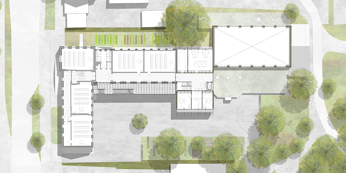 Die Grundschule, bestehend aus mehreren Gebäudetrakten unterschiedlicher Baujahre, sollte in vier Phasen während dem laufenden Betrieb saniert und erweitert werden. Diese gliederten sich in Brandschutzsanierung, Erweiterungsbau, Fassadensanierung und gebäudetechnische Sanierung.